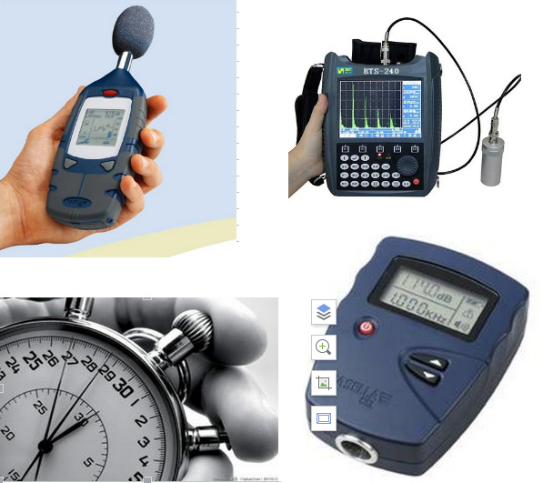 声级计、声校准器、超声波探伤仪、机械秒表、电子秒表